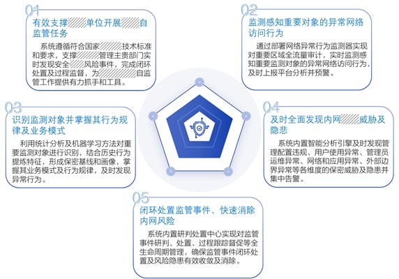 自监管系统以数据安全保密为核心,对人、事、物等重要对象行为进行刻画,从不同类型事件的风险维度进行窃、泄密风险和运行管理风险分析,生成对应的监管事件,为机关单位自己内部监管分析提供依据,并对响应、核实、整改等过程进行监督管理。自监管系统功能涵盖数据采集和汇聚、资产和权限管理、事件分析和处置、运行管理自查自评、态势分析和报告.具有统一标准接口,模块化的架构,并实现对其它系统集成。符合相关单位安全BM建设 的需要,满足单位统一规划、分级部署的要求,有效的从不同类型事件的风险维度进行窃、泄密风险和运行管理风险分析,为机关单位自己内部监管分析提供依据,并辅助对响应、核实、整改等过程进行监督管理。