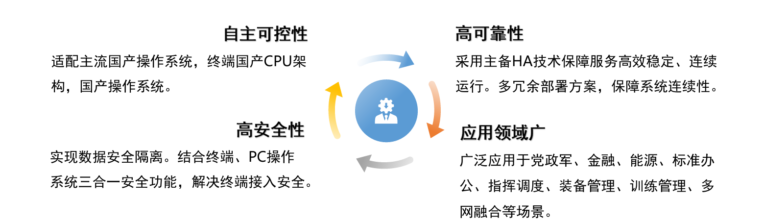 桌面虚拟化管理系统为用户提供安全可信、灵活高效的虚拟桌面服务,衔接现有传统的办公及应用模式,实现对终端设备、桌面环境进行统⼀管理与维护。